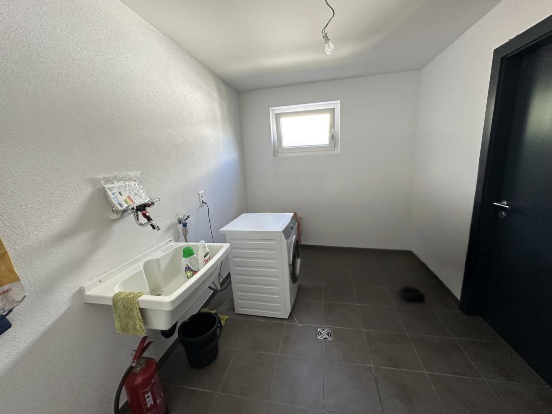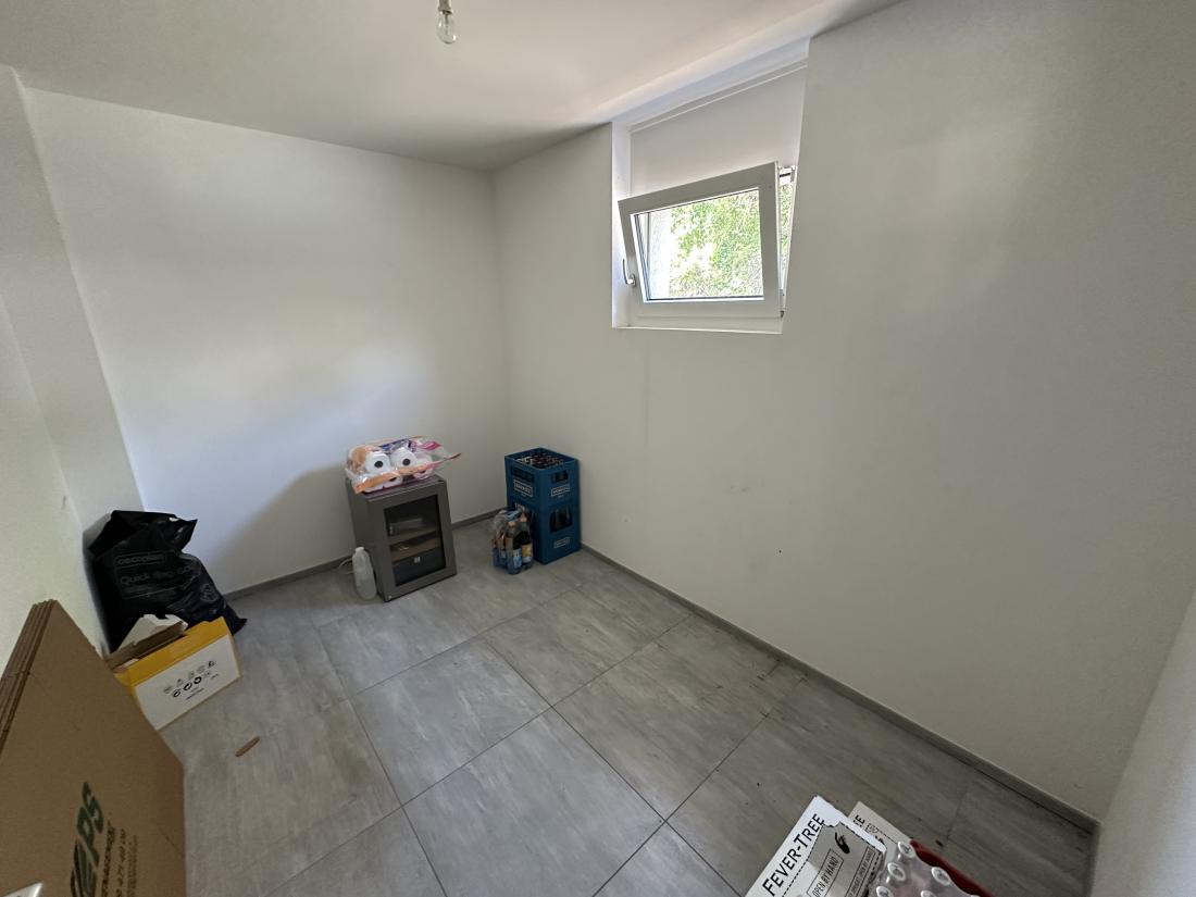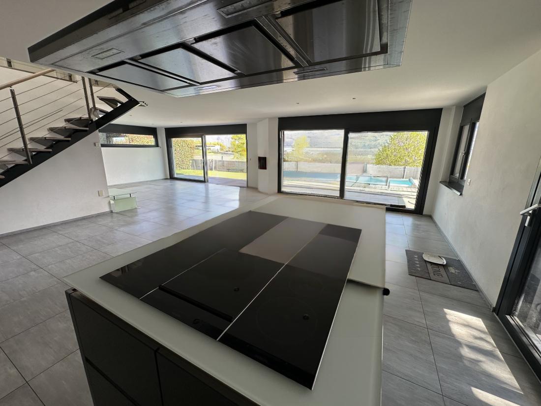 - Hall d’entrée, cuisine agencée ouverte sur le séjour, accès à la terrasse, jardin, piscine extérieure, bureau, réduit, buanderie avec chaufferie, garage-box double, quatre places de parc extérieures ainsi qu’un bureau séparé.